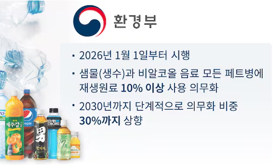 "2026년 1월 1일부터 생수와 비알코올 음료를 담는 페트병은 반드시 10% 이상 재생원료를 사용해야 한다."